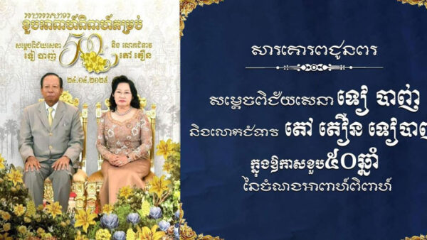 ឯកឧត្តម ឧត្តមសេនីយ៍ឯក រ័ត្ន ស្រ៊ាង ផ្ញើសារគោរពជូនពរសម្តេចពិជ័យសេនា ទៀ បាញ់ និងលោកជំទាវ តៅ តឿន ទៀបាញ់ ក្នុងឱកាសខួប៥០ឆ្នាំ នៃចំណងអាពាហ៍ពិពាហ៍