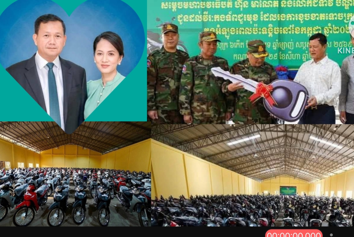 (ភ្នំពេញ)៖ សម្តេចមហាបវរធិបតី ហ៊ុន ម៉ាណែត នាយករដ្ឋមន្ត្រីកម្ពុជា និងលោកជំទាវបណ្ឌិត ពេជ ចន្ទមុន្នី ហ៊ុនម៉ាណែត តាមរយៈលោកអ្នកឧកញ៉ា ទ្រី ភាព បេសកជនពិសេសរបស់សម្តេចតេជោ ហ៊ុន សែន ប្រធានព្រឹទ្ធសភាកម្ពុជា និងលោកជំទាវឧកញ៉ា គៀន ស្រីនា បានឧបត្ថម្ភម៉ូតូចំនួន ១ពាន់គ្រឿងជូនដល់កងទ័ពជួរមុខ ក៏ដូចជាអង្គភាពទ័ពប្រើប្រាស់តាមតម្រូវការចាំបាច់លើកិច្ចការពារជាតិ។
