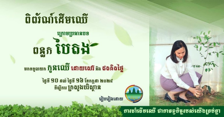 សូមរំលឹកផងដែរថា ព្រឹត្តិការណ៍ជាប្រវត្តិសាស្ត្រ ក្រោមប្រធានបទ”ពន្លកបៃតង” នឹងប្រព្រឹត្តិទៅ នៅខាងមុខអាគារទីស្ដីការក្រសួងបរិស្ថាន ដោយមានការដាក់តាំងបង្ហាញនូវដេីមឈេីជាច្រើនប្រភេទ នៅតាមស្ដង់នីមួយៗ របស់មន្ទីរបរិស្ថាន អង្គការក្រៅរដ្ឋាភិបាលលេីវិស័យ ដែលនឹងចាប់ផ្ដេីមពី ថ្ងៃទី ១០ ខែកក្ដដា ដល់ថ្ងៃទី ១៦ ខែកក្កដា ឆ្នាំ២០២៤នេះ។