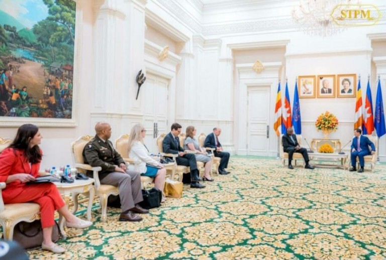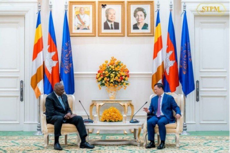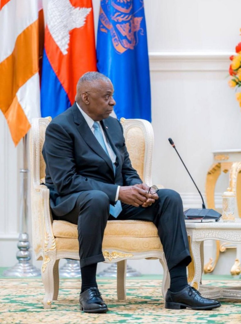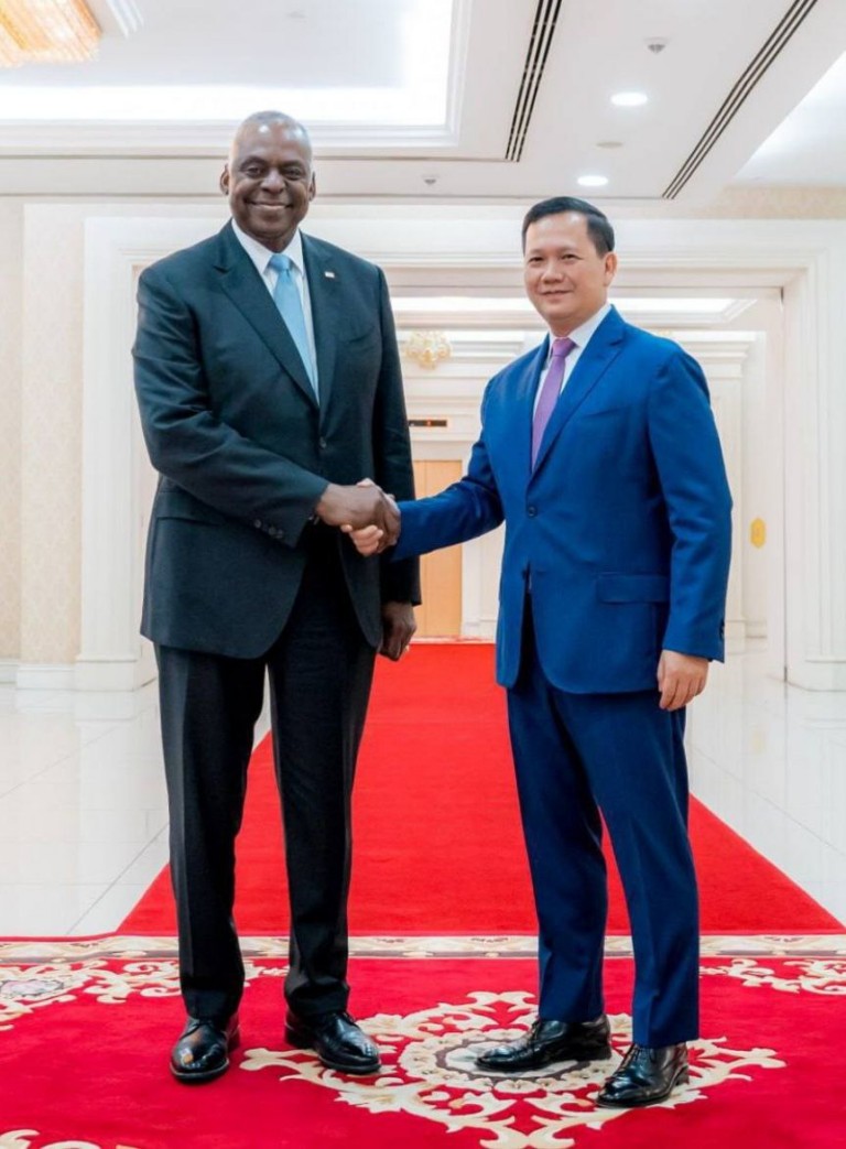 នាព្រឹក ថ្ងៃទី៤ ខែមិថុនា ឆ្នាំ២០២៤ សម្តេចមហាបវរធិបតី ហ៊ុន ម៉ាណែត នាយករដ្ឋមន្ត្រី នៃព្រះរាជាណាចក្រកម្ពុជា បានអនុញ្ញាតឱ្យឯកឧត្តម Lloyd James Austin III រដ្ឋមន្ត្រីក្រសួងការពារជាតិសហរដ្ឋអាមេរិក ចូលជួបសម្តែងការគួរសម និងពិភាក្សាការងារ នៅវិមានសន្តិភាព។