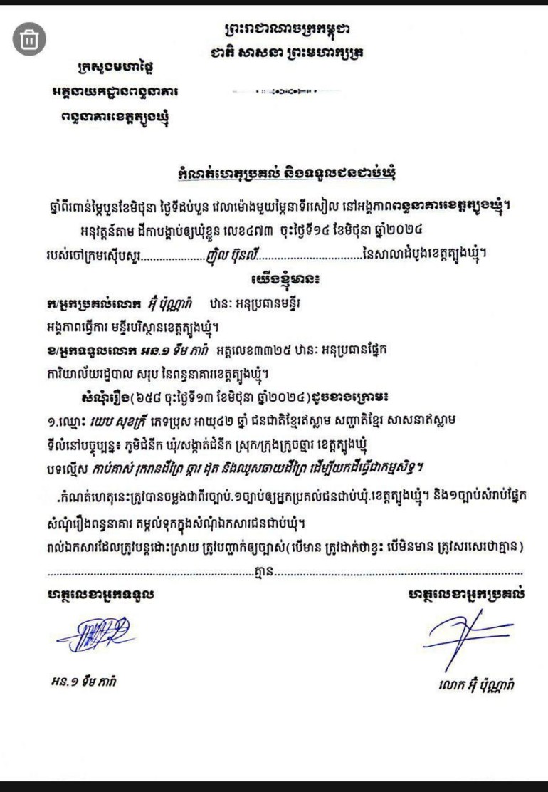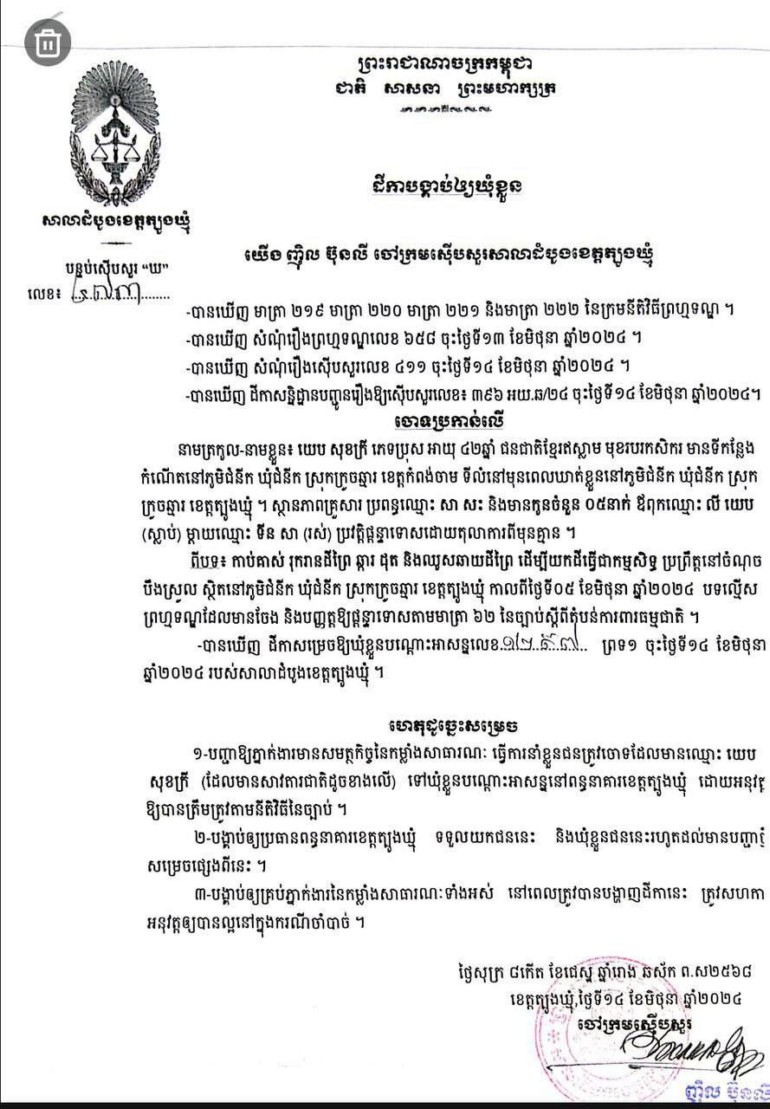 តាមដីការរបស់ចៅក្រមស៊ើបសួរ ញ៉ិល ប៊ុនលី នៃសាលាដំបូងខេត្តត្បូងឃ្មុំ លេខ ៤៧៣ ព្រទ១ ចុះថ្ងៃទី ១៤ ខែមិថុនា ឆ្នាំ ២០២៤ របស់សាលាដំបូងខេត្តត្បូងឃ្មុំ សម្រេចឃុំខ្លួនបណ្តោះអាសន្ននៅពន្ធនាគារខេត្តត្បូងឃ្មុំ ៕