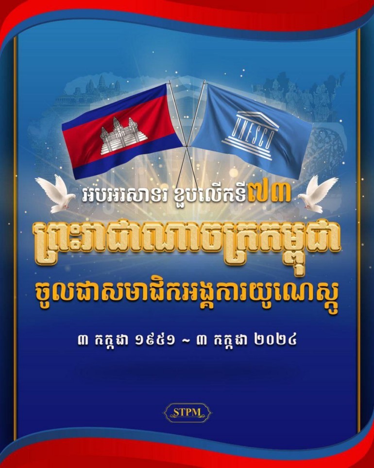 សូមជម្រាបជូនថា ព្រះរាជាណាចក្រកម្ពុជា បានចូលជាសមាជិករបស់អង្គការយូណេស្កូ (UNESCO) នៅថ្ងៃទី៣ ខែកក្កដា ឆ្នាំ១៩៥១ មកដល់ថ្ងៃទី៣ ខែកក្កដា ឆ្នាំ២០២៤នេះ មានរយៈពេល ៧៣ឆ្នាំហើយ។ អង្គការយូណេស្កូ (UNESCO) គឺជាផ្នែកមួយរបស់អង្គការសហប្រជាជាតិ (United Nations)។
