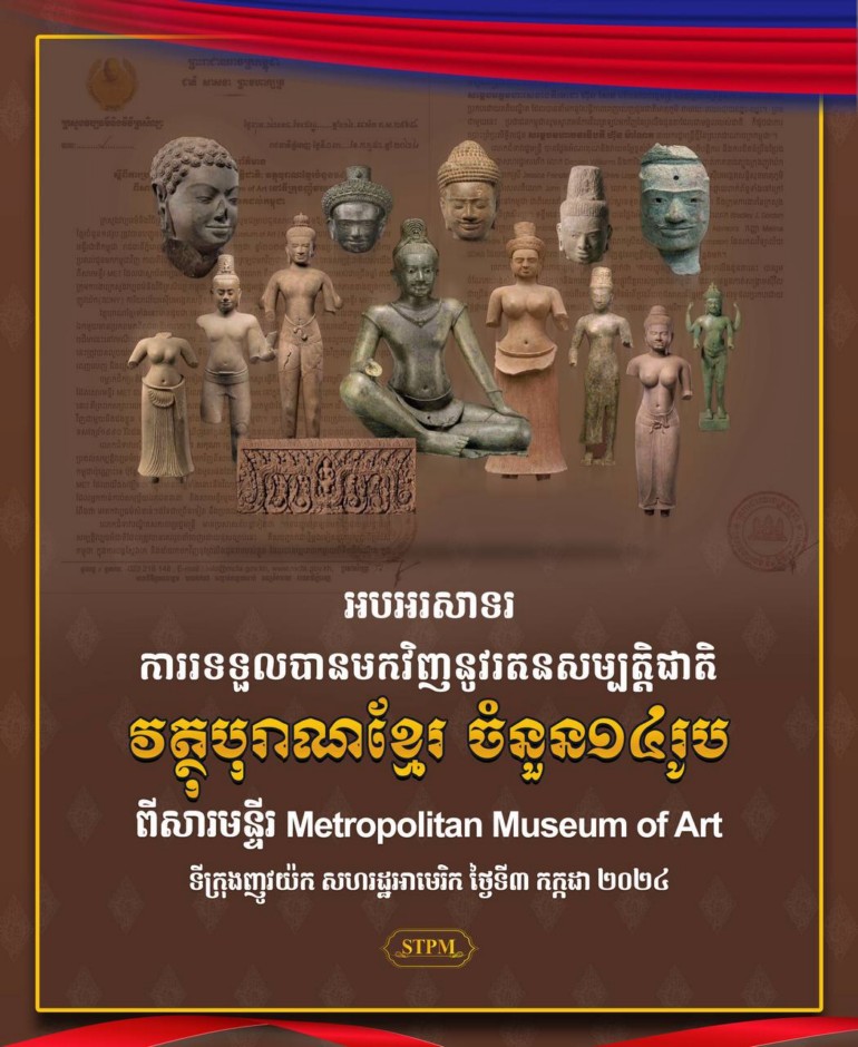 នារសៀលថ្ងៃទី ០៤ ខែកក្កដា ឆ្នាំ២០២៤ នាយកដ្ឋានសារមន្ទីរ បានរៀបចំកម្មវិធីប្រគល់-ទទួលវត្ថុបុរាណខ្មែរចំនួន១៤វត្ថុ ដែលជាសមុច្ច័យរបស់សារមន្ទីរ Metropolitan Museum ហៅកាត់ថា MET នៃសាហរដ្ឋអាមេរិក បានប្រគល់ត្រឡប់មកប្រទេសកម្ពុជាវិញ។