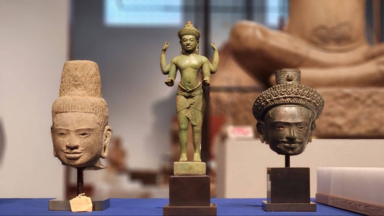 ក្នុងចំណោមវត្ថុទាំង១៤នោះ មានវត្ថុពិចិត្រមួយចំនួនដែលត្រូវបានយកចេញពីប្រទេសកម្ពុជាទៅដូចជា៖ រូបប្រតិមាព្រះនាងឧមា ធ្វើពីថ្មភក់ ដែលត្រូវបានលួចយកចេញទៅក្នុងឆ្នាំ១៩៩៧, ព្រះសិរលោកេសូរ ធ្វើពីសំរិទ្ធដែលមានដងខ្លួនរក្សាទុកនៅក្នុងសារមន្ទីរជាតិ និងប្រតិមាព្រះលោកេសូរធ្វើពីសំរិទ្ធដែលសារមន្ទីរ METទិញពីលោក ឌូគ្លាស ឡាដហ្វដ(Douglas Latchford)ក្នុងឆ្នាំ១៩៩២។ ក្រៅពីនេះមានប្រតិមាផ្សេងៗទៀតធ្វើពីថ្មភក់ និងលោហធាតុចំនួន១១ផ្សេងទៀតក៏បានយោងដំណើរត្រឡប់មកមាតុប្រទេសវិញដោយសុខសុវត្ថិភាព។