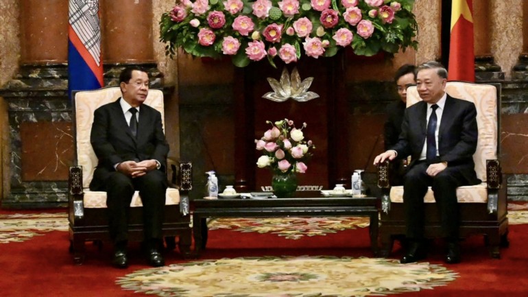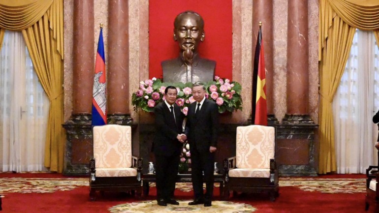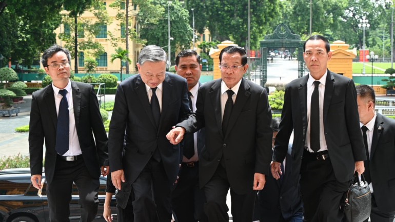 នៅវេលាថ្ងៃត្រង់ ថ្ងៃព្រហស្បតិ៍ ៥ រោច ខែអាសាឍ ឆ្នាំរោង ឆស័ក ពុទ្ធសករាជ ២៥៦៨ ត្រូវនឹងថ្ងៃទី២៥ ខែកក្កដា ឆ្នាំ២០២៤ ក្នុងឱកាសនៃការអញ្ជើញចូលរួម គោរពវិញ្ញាណក្ខន្ធសព ឯកឧត្តម ង្វៀន ភូជុង អគ្គលេខាធិការមជ្ឈមបក្សកុម្មុយនីស្តវៀតណាម នៅរដ្ឋធានីហាណូយ ប្រទេសវៀតណាម សម្តេចអគ្គមហាសេនាបតីតេជោ ហ៊ុន សែន ប្រធានព្រឹទ្ធសភា នៃព្រះរាជាណាចក្រកម្ពុជា និងជាប្រធានគណបក្សប្រជាជនកម្ពុជា បានអញ្ជើញជួបពិភាក្សាជាមួយ ឯកឧត្តម តូ ឡឹម ប្រធានរដ្ឋ នៃសាធារណរដ្ឋសង្គមនិយមវៀតណាម។