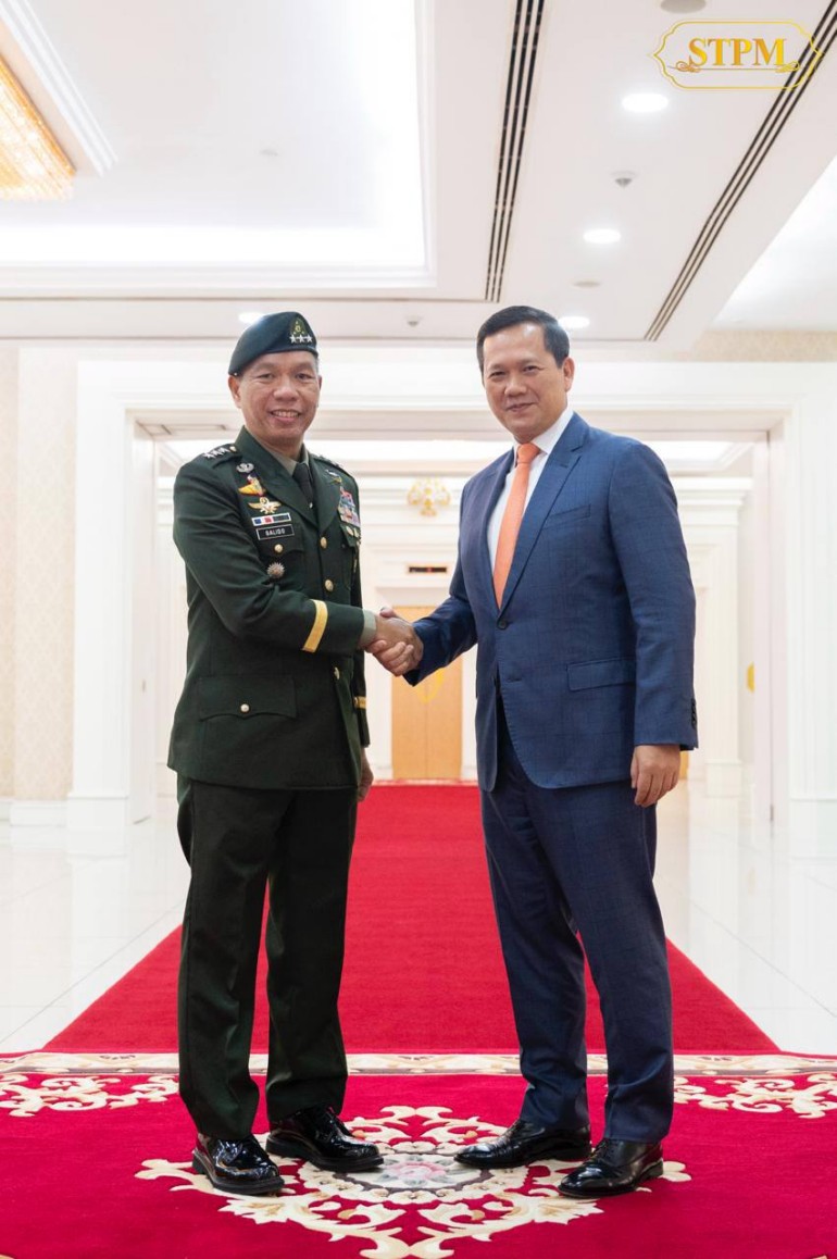 រាជធានីភ្នំពេញ ៖ ព្រឹកថ្ងៃចន្ទ ទី២៩ កក្កដា ២០២៤ សម្តេចធិបតី ហ៊ុន ម៉ាណែត នាយករដ្ឋមន្ត្រី នៃព្រះរាជាណាចក្រកម្ពុជា បានអនុញ្ញាតអោយ ឯកឧត្តម ឧត្តមសេនីយ៍ឯក Roy M. Galido មេបញ្ជាការកងទ័ពជើងគោកនៃសាធារណរដ្ឋហ្វីលីពីន ចូលជួបសម្ដែងការគួរសម និងពិភាក្សាការងារនៅវិមានសន្តិភាព ។