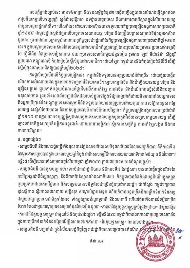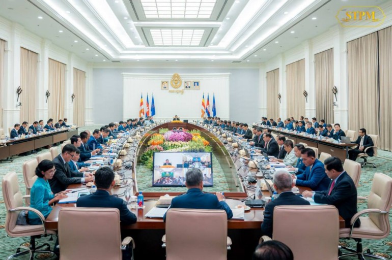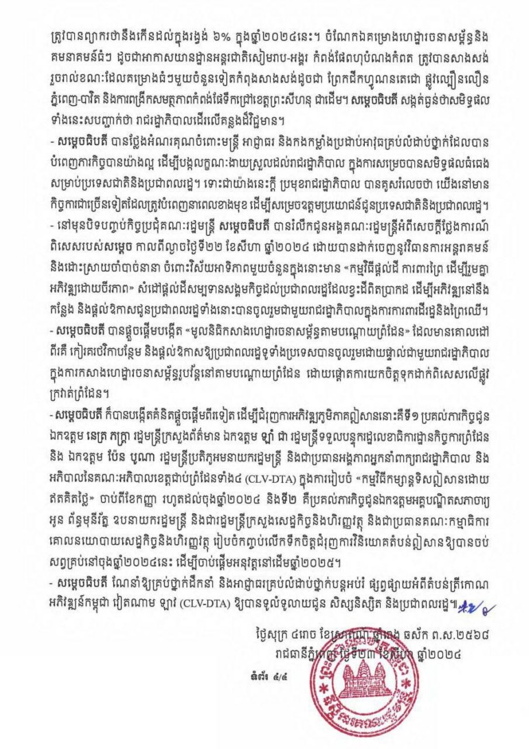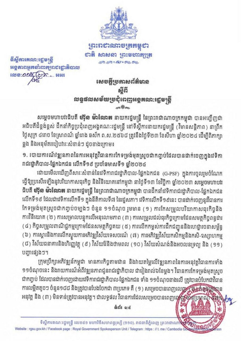 ភ្នំពេញ ៖ នៅព្រឹកថ្ងៃទី២៣ ខែសីហា ឆ្នាំ២០២៤ សម្តេចមហាបវរធិបតី ហ៊ុន ម៉ាណែត នាយករដ្ឋមន្ត្រី នៃព្រះរាជាណាចក្រកម្ពុជា បានអញ្ជើញដឹកនាំកិច្ចប្រជុំពេញអង្គគណ:រដ្ឋមន្ត្រី នៅទីស្តីការគណៈរដ្ឋមន្ត្រី វិមានសន្តិភាព ដើម្បីពិនិត្យនិងពិភាក្សាលើរបៀបវារៈចំនួន ៤ ៖