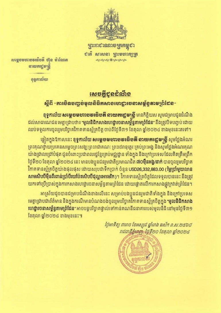 ឆ្លៀតក្នុងឱកាសនេះ ខុទ្ទកាល័យ សម្តេចមហាបវរធិបតី នាយករដ្ឋមន្ត្រី សូមថ្លែងអំណរព្រះគុណថ្វាយប្រគេនសម្តេចព្រះសង្ឃ ព្រះរាជាគណៈ ព្រះថេរានុត្ថេរៈគ្រប់ព្រះអង្គ និងសូមថ្លែងអំណរគុណ យ៉ាងជ្រាលជ្រៅបំផុត ជូនចំពោះប្រជាពលរដ្ឋខ្មែរគ្រប់មជ្ឈដ្ឋាន ទាំងក្នុង និងក្រៅប្រទេស ដែលគិតត្រឹមព្រឹកថ្ងៃទី២០ ខែតុលា ឆ្នាំ២០២៤ នេះ មានបងប្អូនជនរួមជាតិប្រមាណជិត៧០ម៉ឺនអង្គ/នាក់ បានចូលរួមបរិច្ចាគវិភាគទានស្ម័គ្រចិត្តយ៉ាងផុលផុសដោយសរុបជាទឹកប្រាក់ ចំនួន USD26,332,883.00 (ម្ភៃប្រាំមួយលានសាមសិបបីម៉ឺនពីរពាន់ប្រាំបីរយប៉ែតសិបបីដុល្លារអាមេរិក)។ វិភាគទានស្ម័គ្រចិត្តដែលទទួលបាននេះ នឹងត្រូវ យកទៅប្រើប្រាស់ក្នុងការកសាងហេដ្ឋារចនាសម្ព័ន្ធតាមព្រំដែន ដោយផ្តោតលើការកសាងផ្លូវក្រវាត់ព្រំដែន ។