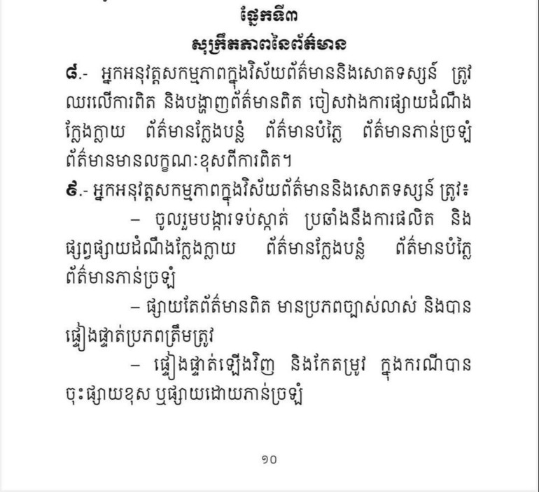 ៣-អ្នកអនុវត្តសកម្មភាពក្នុងវិស័យព័ត៌មាននិងសោតទស្សន៍ត្រូវចៀសវាង (ក) ការចុះផ្សាយព័ត៌មានដែលគ្មានប្រភពច្បាស់លាស់ ឬធ្វើការចោទប្រកាន់ដែលមិនមានភស្តុតាងគ្រប់គ្រាន់ និងច្បាស់លាស់ (ខ)កាឡៃព័ត៌មានតាមរូបភាពណាមួយដែលធ្វើឱ្យប្រាសចាកន័យដើម (គ) បញ្ចេញមតិផ្ទាល់ខ្លួនឈរលើបុរេវិនិច្ឆ័យ (ឃ) ច្របល់គ្នារវាង ការពិតដែលជាអង្គហេតុ និងការយល់ឃើញដែលជាទស្សនៈផ្ទាល់ខ្លួន (ង) កែប្រែព័ត៌មាន រូបភាព ឬវីដេអូ លុបបំបាត់ចោលផ្នែកព័ត៌មានសំខាន់ៗ ឬបន្លំឯកសារផ្សេងៗ៕