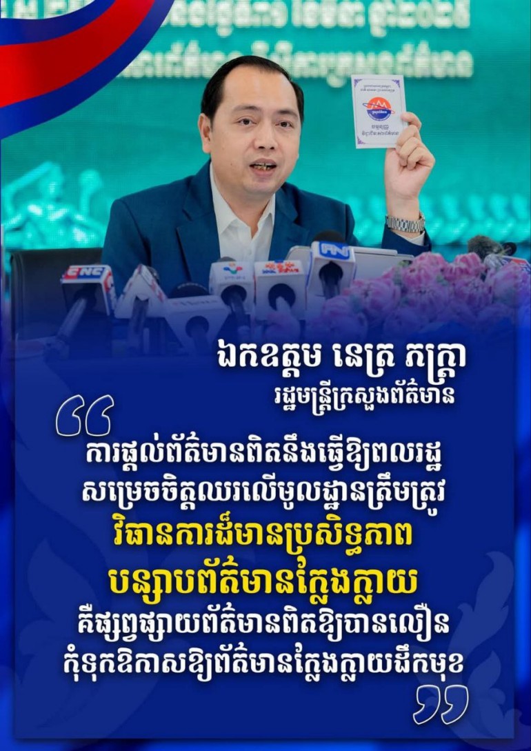 ភ្នំពេញ៖ ក្នុងបណ្តាញទំនាក់ទំនងសង្គម ឯកឧត្តម នេត្រ ភក្ត្រា រដ្ឋមន្ត្រី ក្រសួងព័ត៌មានបានបញ្ជាក់ថា អ្នកសារព័ត៌មានត្រូវតែចុះយកព័ត៌មានពិត មិនបង្កើតព័ត៌មានក្លែងក្លាយ មិនផ្សព្វផ្សាយ និងមិនចែករំលែកព័ត៌មានក្លែងក្លាយ! ការផ្តល់ព័ត៌មានពិតនឹងធ្វើឱ្យប្រជាពលរដ្ឋមានមូលដ្ឋានសម្រេចចិត្តត្រឹមត្រូវ។