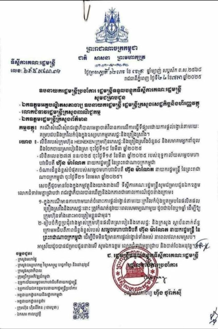 កាលពីថ្ងៃទី២៤ ខែមេសា ឆ្នាំ២០២៥កន្លងទៅនេះ ទីស្តីការគណៈរដ្ឋមន្ត្រី បានផ្ញើលិខិតមួយទៅកាន់លោកអគ្គបណ្ឌិតសភាចារ្យ អូនព័ន្ធ មុនីរ័ត្ន ឧបនាយករដ្ឋមន្ត្រី រដ្ឋមន្ត្រីក្រសួងសេដ្ឋកិច្ច និងហិរញ្ញវត្ថុ, លោកស្រី ចម និម្មល រដ្ឋមន្ត្រីក្រសួងពាណិជ្ជកម្ម និងលោក នេត្រ ភក្ត្រា រដ្ឋមន្ត្រីក្រសួងព័ត៌មាន ដោយឱ្យចាត់វិធានការលើការធ្វើទីផ្សារដោយការផ្ដល់រង្វាន់តាមរយៈ គម្របដប និងក្រវិលកំប៉ុងក្នុងឧស្សាហកម្មភេសជ្ជៈ និងគ្រឿងស្រវឹង។