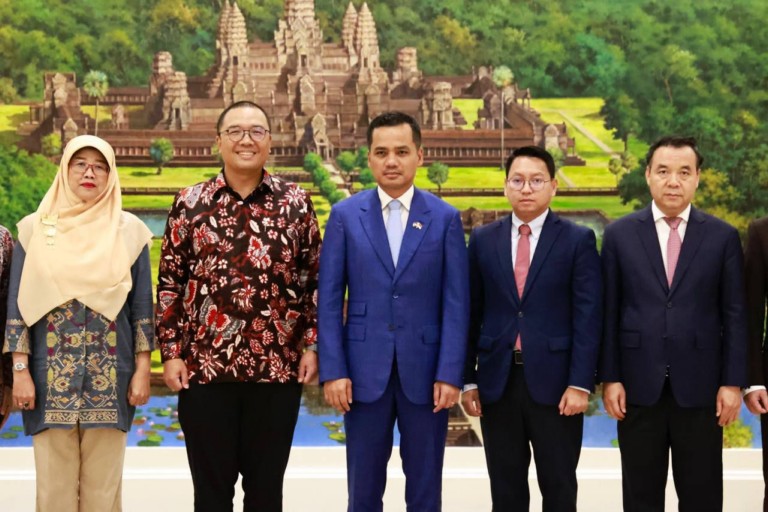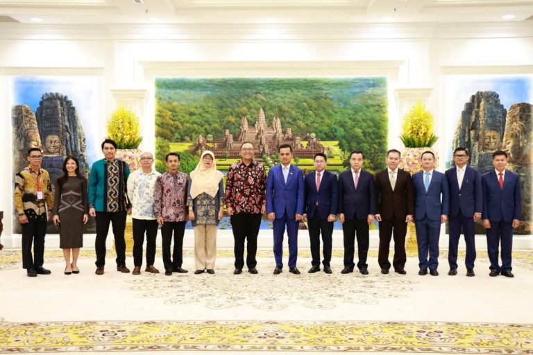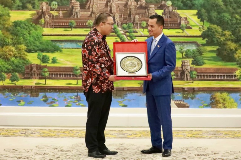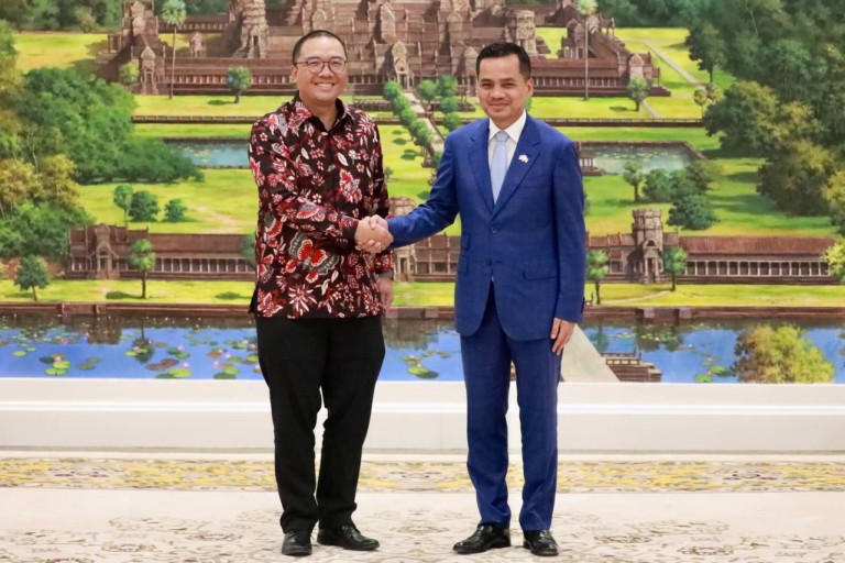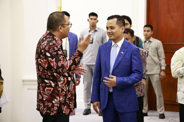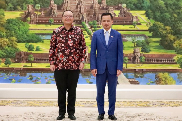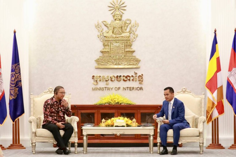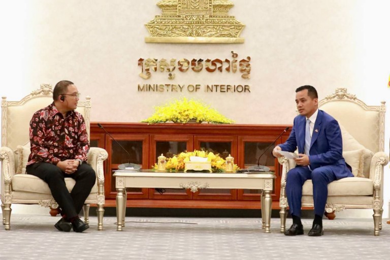 លទ្ធផលប្រកបដោយវិជ្ជមាននៃទំនាក់ទំនងការទូតរវាងព្រះរាជាណាចក្រកម្ពុជា និងសាធារណរដ្ឋឥណ្ឌូណេសុី ត្រូវបានកត់សម្គាល់ដោយឯកឧត្តមអភិសន្តិបណ្ឌិត ស សុខា ឧបនាយករដ្ឋមន្ត្រី រដ្ឋមន្ត្រីក្រសួងមហាផ្ទៃ ក្នុងជំនួបជាមួយឯកឧត្ដមបណ្ឌិត សាន់តូ ដាម៉ូស៊ូម៉ាតូ ឯកអគ្គរដ្ឋទូតថ្មី នៃប្រទេសឥណ្ឌូណេស៊ី ប្រចាំព្រះរាជាណាចក្រកម្ពុជា នារសៀលថ្ងៃទី១៣ ខែឧសភា ឆ្នាំ២០២៤ នៅទីស្តីកាេក្រសួងមហាផ្ទៃ។