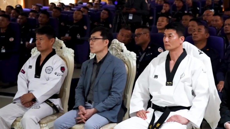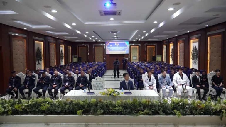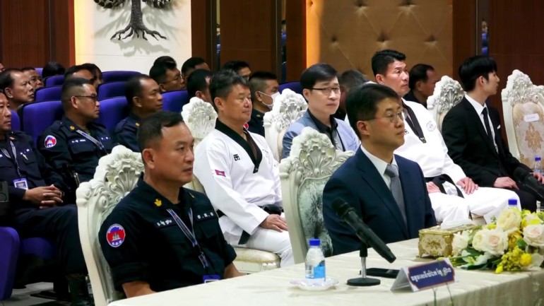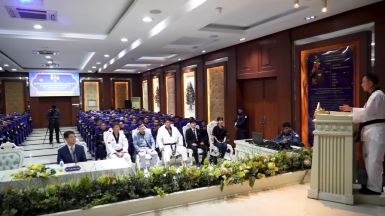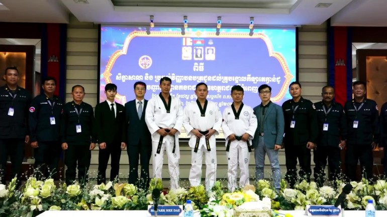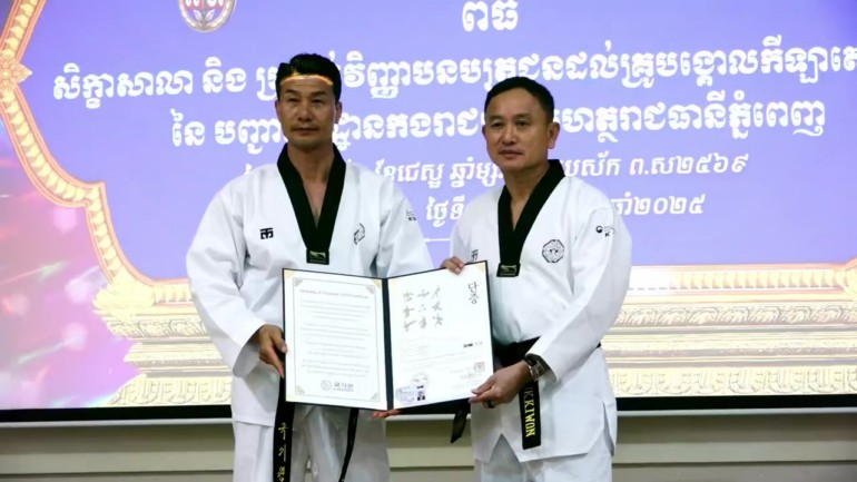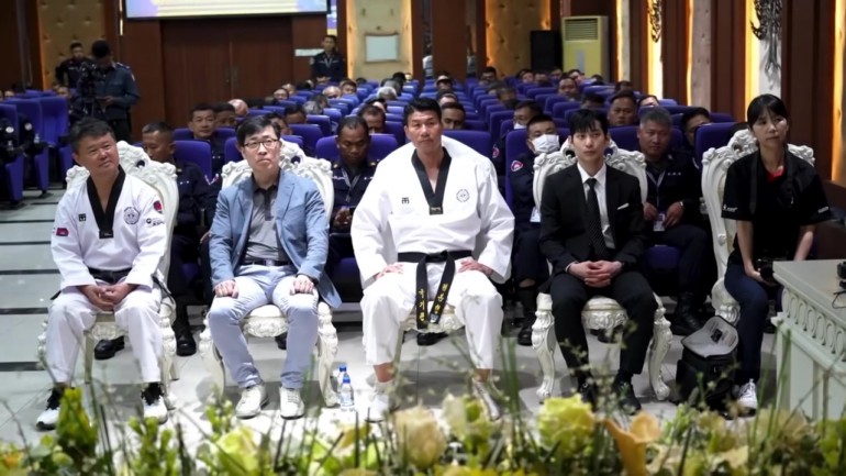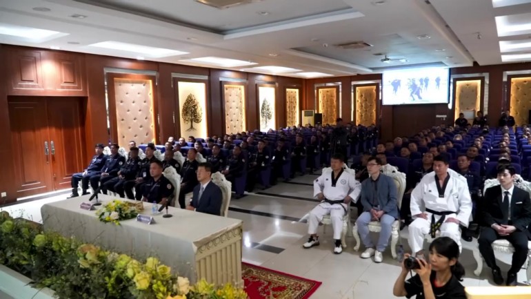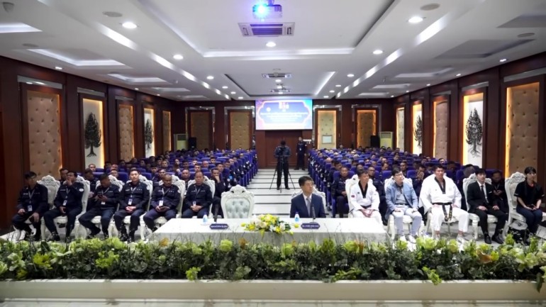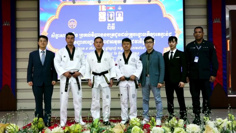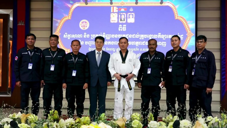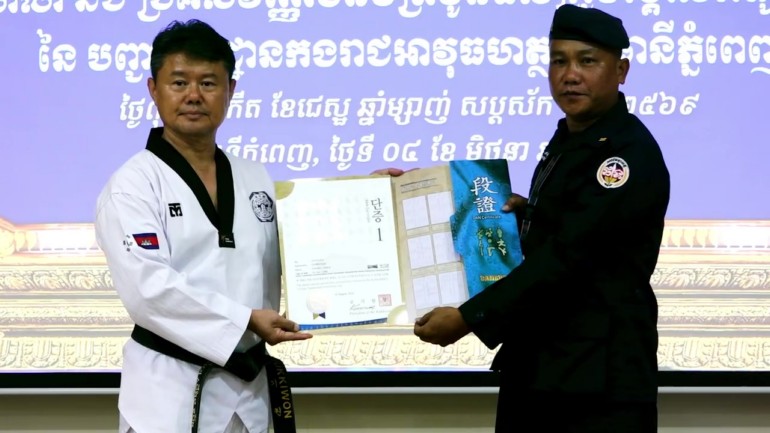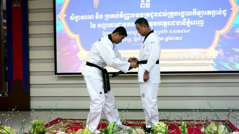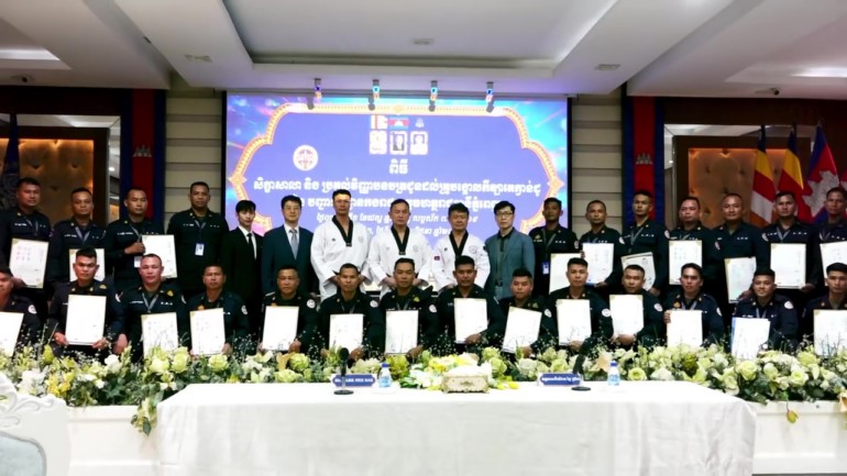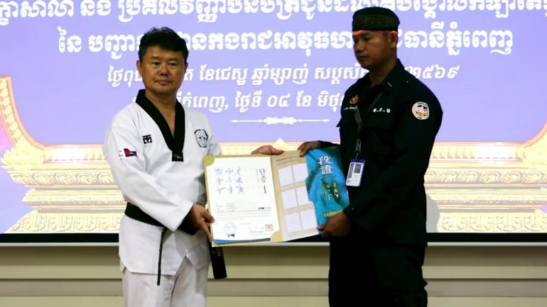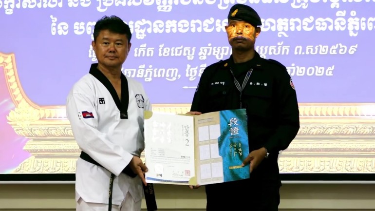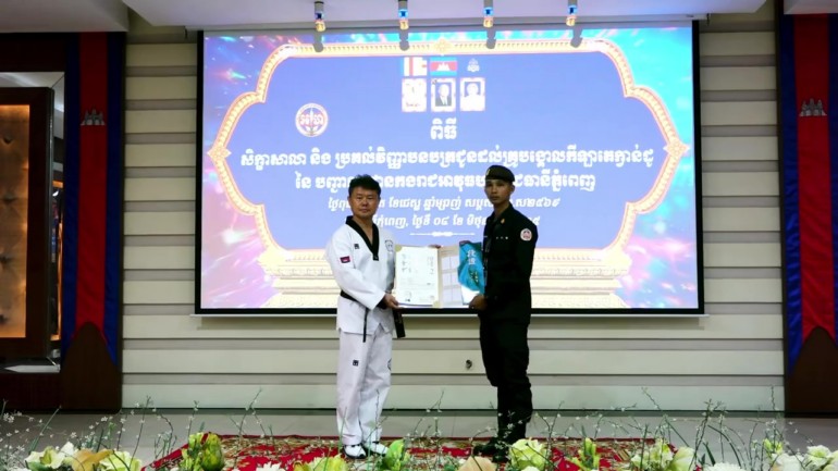 នារសៀល ថ្ងៃទី០៤ ខែមិថុនា ឆ្នាំ២០២៥ នៅបញ្ជាការដ្ឋានកងរាជអាវុធហត្ថរាជធានីភ្នំពេញ បានប្រារព្ធ ពិធីប្រគល់វិញ្ញាបនបត្រ ជូនដល់គ្រូបង្គោលកីឡាតេក្វាន់ដូ នៃកងរាជអាវុធហត្ថរាជធានីភ្នំពេញ ចំនួន ២៨នាក់ ក្រោមអធិបតីភាព លោកឧត្តមសេនីយ៍ឯក រ័ត្ន ស្រ៊ាង មេបញ្ជាការរង កងរាជអាវុធហត្ថលើផ្ទៃប្រទេស មេបញ្ជាការ កងរាជអាវុធហត្ថរាជធានីភ្នំពេញ និង លោក ផាក ហ៊ីដេ (Mr.PARK HEE DAE) តំណាងស្ថានទូតសាធារណរដ្ឋកូរ៉េខាងត្បូង ប្រចាំកម្ពុជា ដោយមានការចូលរួមពី លោកគ្រូជម្រើសជាតិកីឡាតេក្វាន់ដូប្រចាំកម្ពុជា គ្រូក្បាច់គុនការពារខ្លួនគូកគីវ៉ុន សាធារណរដ្ឋកូរ៉េខាងត្បូង ព្រមទាំង លោកមេបញ្ជាការរង នាយសេនាធិការរង ប្រធាន-អនុប្រធានមន្ទីរ នាយ-នាយរងការិយាល័យ លោកមេបញ្ជាការ មេបញ្ជាការរង មូលដ្ឋានអាវុធហត្ថខណ្ឌទាំង១៤ និងលោកមេបញ្ជាការវរសេនាតូចចល័ត នៃកងរាជអាវុធហត្ថរាជធានីភ្នំពេញ ជាច្រើនរូបទៀត។