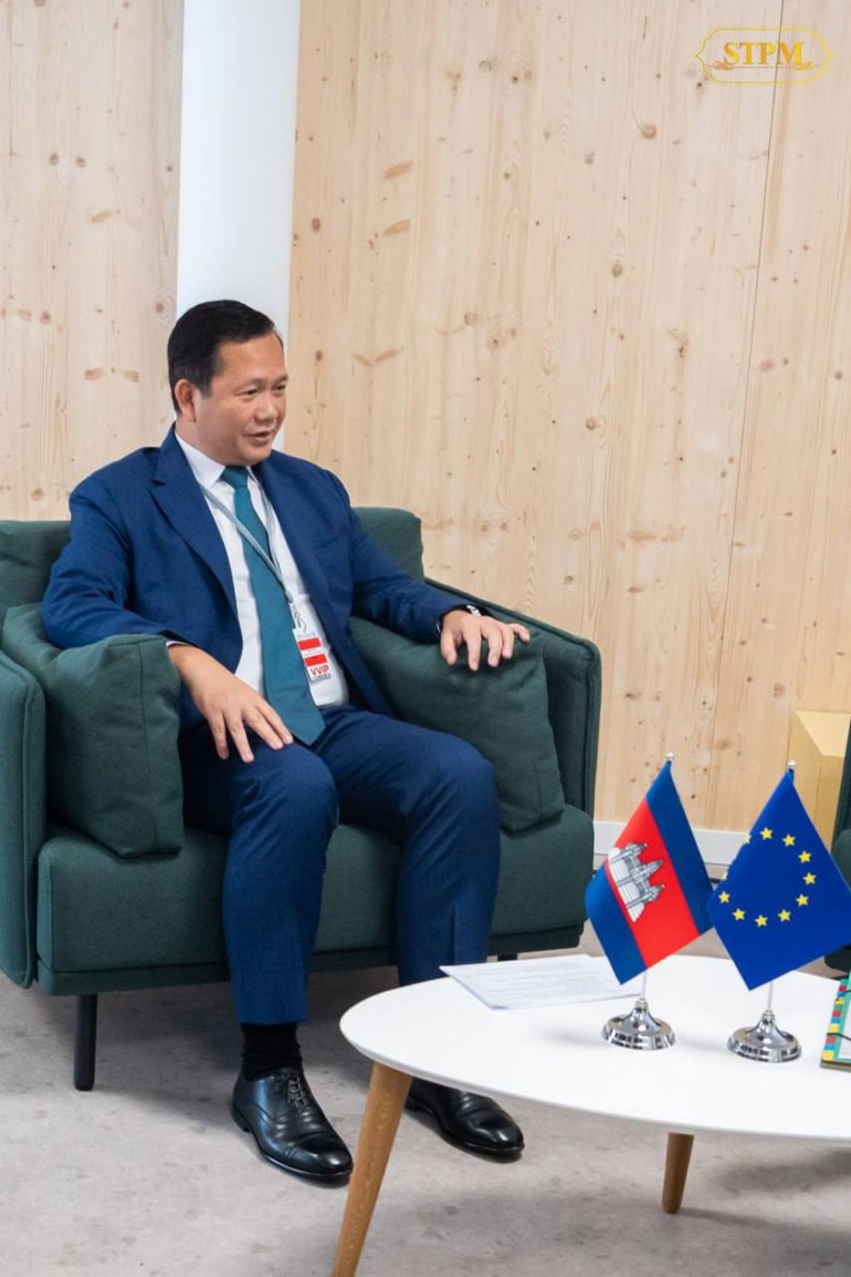 ជាការឆ្លើយតប សម្តេចបវរធិបតីបានថ្លែងអំណរគុណដល់សហភាពអឺរ៉ុបដែលបានរួមចំណែកដល់ការអភិវឌ្ឍសង្គម-សេដ្ឋកិច្ចនៅកម្ពុជាកន្លងមក តាមរយៈការអនុវត្តគម្រោងរួមគ្នារវាងកម្ពុជា-សហភាពអឺរ៉ុប។ តាមរយៈកិច្ចសហប្រតិបត្តិការដ៏ល្អនេះ សម្តេចបវរធិបតីសង្ឃឹមយ៉ាងមុតមាំថា សហភាពអឺរ៉ុបនឹងនៅតែបន្តធ្វើជាដៃគូ ជាមួយកម្ពុជា ក្រោយពេលចាកចេញពីឋានៈជាក្រុមប្រទេសអភិវឌ្ឍន៍តិចតួចនៅឆ្នាំ២០២៩ ខាងមុខ។ ចំពោះការដោះស្រាយបញ្ហាប្រឈមក្នុងវិស័យជលផល កម្ពុជាបានដាក់ចេញនូវវិធានការជាក់ស្តែងជាច្រើន ដែលក្នុងនោះមានការជំរុញការអនុម័តច្បាប់ស្ដីពីជលផលដែលបានឆ្លងរដ្ឋសភារួច ហើយព្រឹទ្ធសភានឹងបន្តពិនិត្យលើសេចក្តីព្រាងច្បាប់នេះក្នុងខែមិថុនានេះ។ ក្រៅពីវិស័យជលផល កម្ពុជាបានប្តេជ្ញាចិត្តខ្ពស់ដើម្បីជំរុញការប្រើប្រាស់ថាមពលកកើតឡើងវិញឱ្យបាន ៧០% នៅឆ្នាំ២០៣០ និងសម្រេចបាននូវអព្យាក្រឹតកាបូននៅឆ្នាំ២០៥០ បើទោះបីជាប្រទេសកម្ពុជាមិនមែនជាប្រទេសដែលបំភាយឧស្ម័នកាបូនិកក៏ដោយ។ សម្តេចបវរធិបតី បានគូសបញ្ជាក់ថា ស្របពេលដែលពិភពលោកកំពុងជួបប្រទះនឹងភាពមិនប្រាកដប្រជា កម្ពុជានៅតែរក្សាជំហរប្រកាន់ខ្ជាប់ពហុភាគីនិយម។ កម្ពុជាធ្លាប់រងគ្រោះសង្គ្រាមស៊ីវិលជាច្រើនទសវត្សរ៍ និងយល់ច្បាស់អំពីផលវិបាកនៃសង្គ្រាម ជាពិសេសគ្រាប់មីន និងយុទ្ធភណ្ឌមិនទាន់ផ្ទុះ។