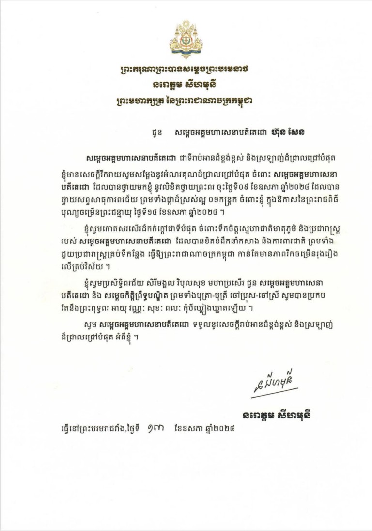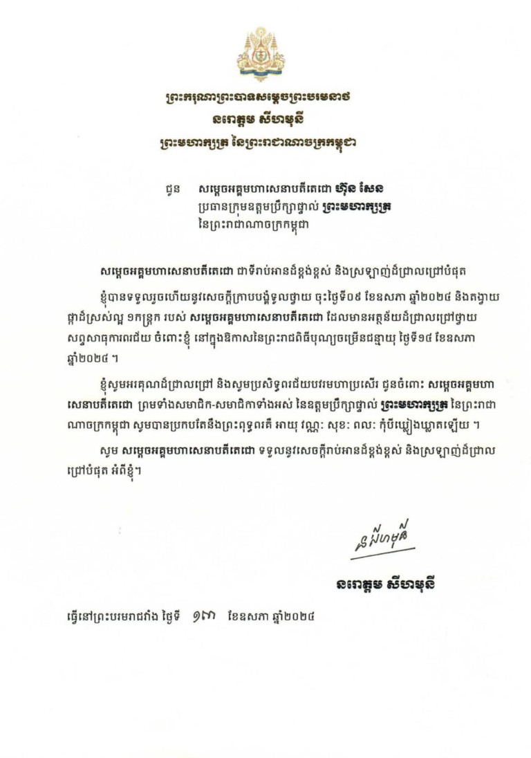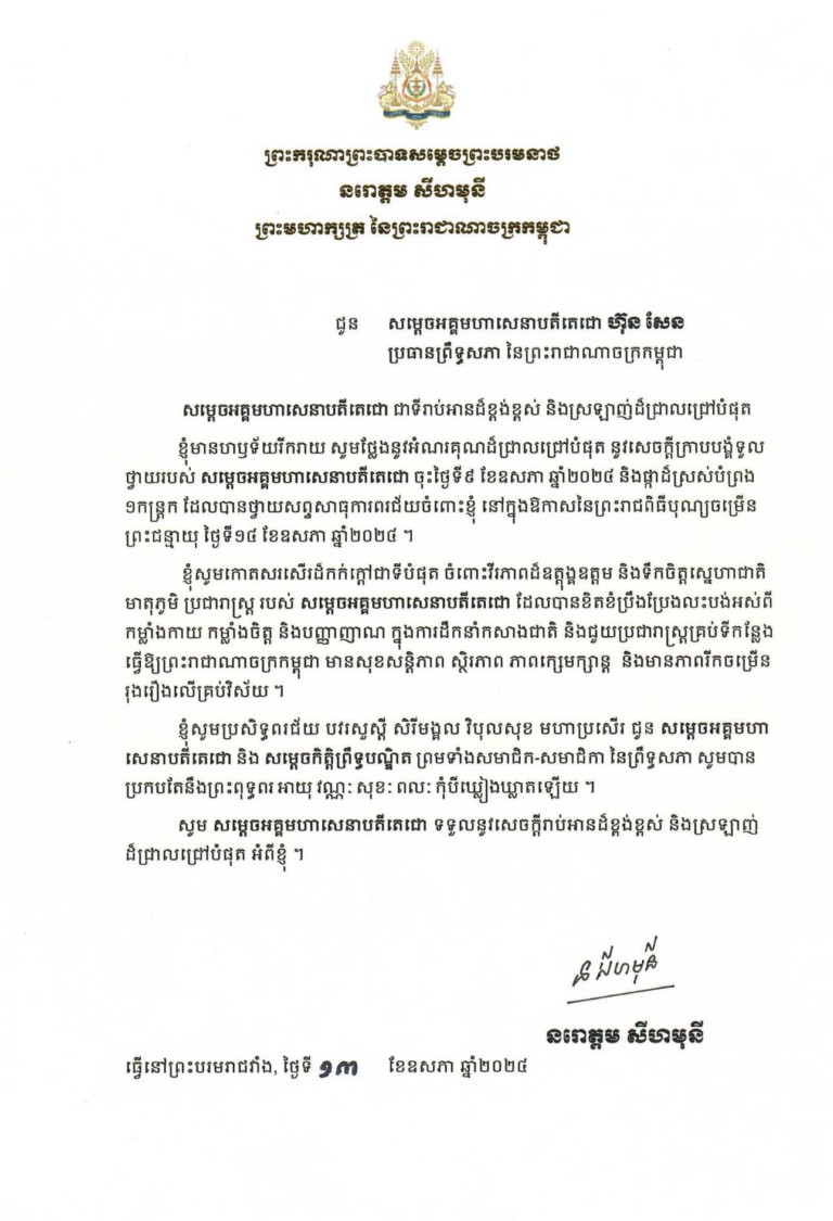 ព្រះករុណាព្រះបាទសម្តេចព្រះបរមនាថ នរោត្តម សីហមុនី ព្រះមហាក្សត្រ នៃព្រះរាជាណាចក្រកម្ពុជា ផ្ញើព្រះរាជសារថ្លែងអំណរគុណ សម្ដេចអគ្គមហាសេនាបតីតេជោ ហ៊ុន សែន ប្រធានព្រឹទ្ធសភានៃព្រះរាជាណាចក្រកម្ពុជា ប្រធានក្រុមឧត្ដមប្រឹក្សាផ្ទាល់ព្រះមហាក្សត្រ ។ ខាងក្រោមនេះ ជាខ្លឹមសារទាំងស្រុង ដូចតទៅ ៖