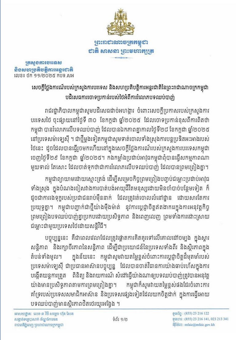 (ភ្នំពេញ)៖ តាមរយៈសេចក្តីថ្លែងការណ៍របស់ក្រសួងការបរទេសបានប្រកាសថា រាជរដ្ឋាភិបាលកម្ពុជា សូមបដិសេធដាច់អហង្ការចំពោះសេចក្តីប្រកាសរបស់ ក្រសួងការបរទេសថៃ ចុះផ្សាយនៅថ្ងៃទី៣០ ខែកក្កដា ឆ្នាំ២០២៥ ដែលចោទប្រកាន់ខុសពីការពិតថា កម្ពុជាបានរំលោភលើបទឈប់បាញ់ ដែលបានឯកភាពគ្នាកាលថ្ងៃទី២៨ ខែកក្កដា ឆ្នាំ២០២៥នៅប្រទេសម៉ាឡេស៊ី។
