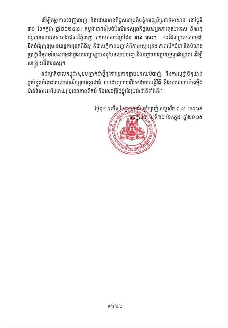 កម្ពុជាព្យាយាមដោយស្មោះត្រង់ ដើម្បីសម្រេចកិច្ចព្រមព្រៀងបញ្ចប់ជម្លោះប្រដាប់អាវុធទាំងស្រុង ក្នុងបំណងចៀសវាងការបាត់បង់អាយុជីវិតមនុស្ស ដោយមិនចាំបាច់បន្ថែមទៀត ក៏ដូចជាការរងទុក្ខរបស់ប្រជាជនរាប់ម៉ឺននាក់ ដែលត្រូវរត់ចោលលំនៅដ្ឋាន ដោយសារតែការប្រយុទ្ធគ្នា កម្ពុជាបញ្ជាក់ជាថ្មីយ៉ាងម៉ឺងម៉ាត់នូវការប្តេជ្ញាចិត្តឥតងាករេក្នុងការអនុវត្តកិច្ចព្រមព្រៀងបទឈប់បាញ់គ្នាប្រកបដោយប្រសិទ្ធភាព និងពេញលេញ ព្រមទាំងការដោះស្រាយជម្លោះជាមួយប្រទេសថៃដោយសន្តិវិធី។