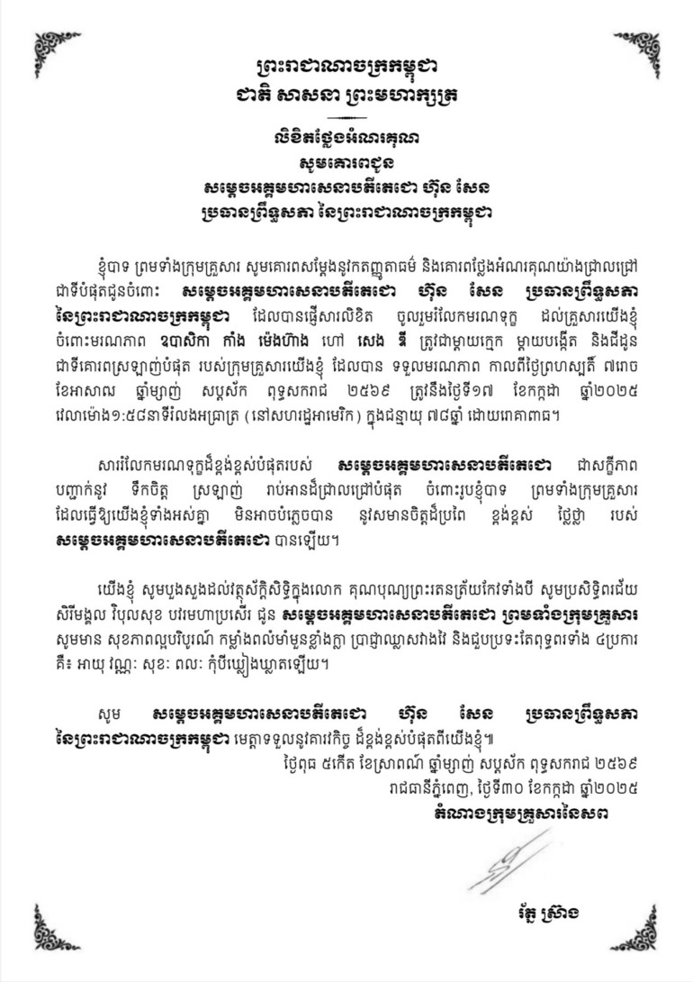 នៅក្នុងលិខិតថ្លែងអំណរគុណបានសរសេរថា «ខ្ញុំបាទ ព្រមទាំងក្រុមគ្រួសារ សូមគោរពសម្តែងនូវកតញ្ញូតាធម៌ និងគោរពថ្លែងអំណរគុណយ៉ាងជ្រាលជ្រៅជាទីបំផុតជូនចំពោះ សម្តេចតេជោ ហ៊ុន សែន ប្រធានព្រឹទ្ធសភានៃព្រះរាជាណាចក្រកម្ពុជា ដែលបានផ្ញើសារលិខិតចូមរួមរំលែកទុក្ខដល់ក្រុមគ្រួសារយើងខ្ញុំ ចំពោះមរណភាពរបស់ ឧបាសិកា កាំង ម៉េងហ៊ាង ហៅ សេង ឌី ដែលត្រូវជាម្តាយក្មេក ម្តាយបង្កើត និងជីដូន ជាទីគោរពស្រឡាញ់បំផុតរបស់ក្រុមគ្រួសារយើងខ្ញុំ។