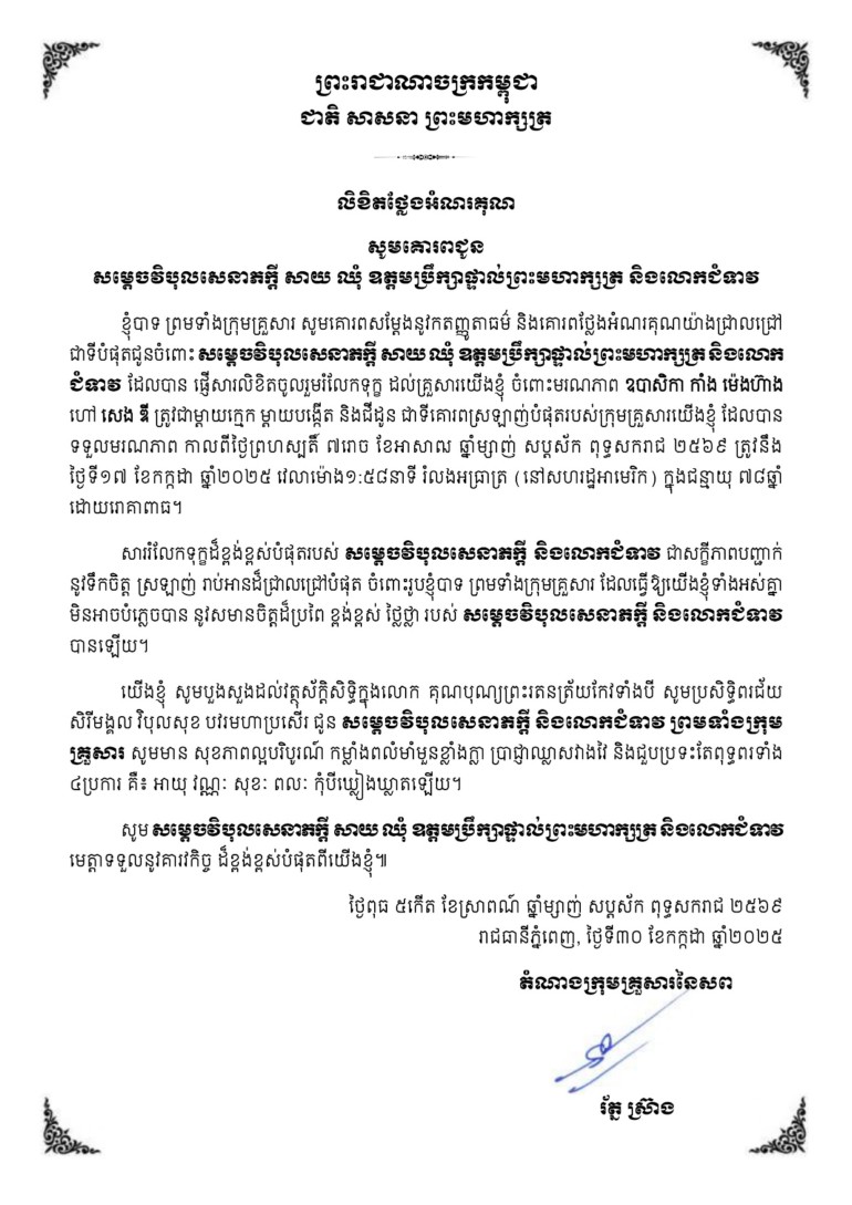 នៅក្នុងលិខិតថ្លែងអំណរគុណបានសរសេរថា «ខ្ញុំបាទ ព្រមទាំងក្រុមគ្រួសារ សូមគោរពសម្តែងនូវកតញ្ញូតាធម៌ និងគោរពថ្លែងអំណរគុណយ៉ាងជ្រាលជ្រៅជាទីបំផុតជូនចំពោះ សម្តេចវិបុលសេនាភក្តី សាយ ឈុំ ឧត្តមប្រឹក្សាផ្ទាល់ព្រះមហាក្សត្រ និងលោកជំទាវ ដែលបានផ្ញើសារលិខិតចូមរួមរំលែកទុក្ខដល់ក្រុមគ្រួសារយើងខ្ញុំ ចំពោះមរណភាពរបស់ ឧបាសិកា កាំង ម៉េងហ៊ាង ហៅ សេង ឌី ដែលត្រូវជាម្តាយក្មេក ម្តាយបង្កើត និងជីដូន ជាទីគោរពស្រឡាញ់បំផុតរបស់ក្រុមគ្រួសារយើងខ្ញុំ។
