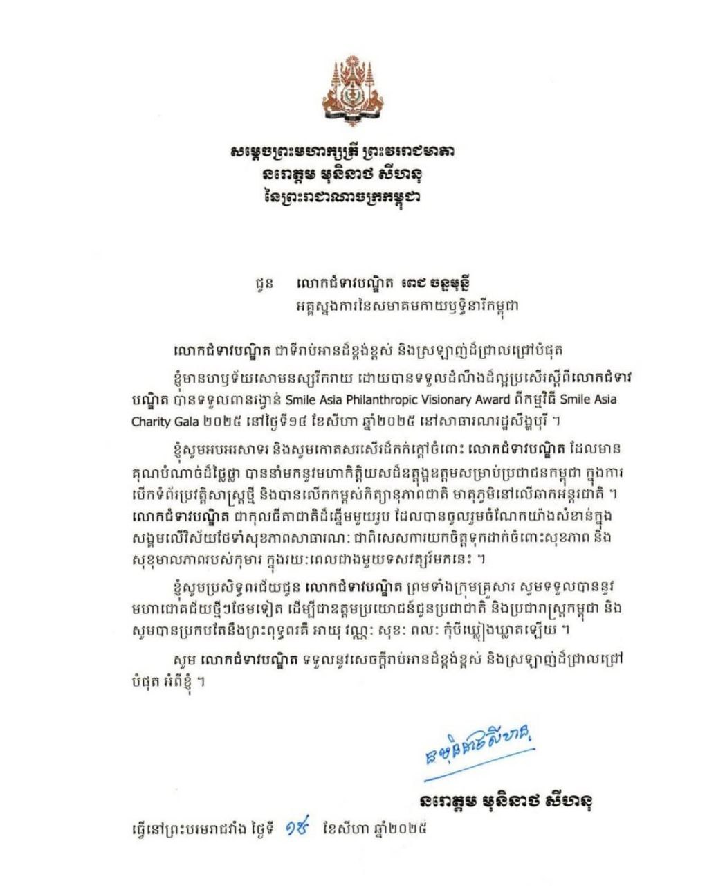 ខ្ញុំមានហឫទ័យសោមនស្សរីករាយ ដោយបានទទួលដំណឹងដ៏ល្អប្រសើរ ស្តីពីលោកជំទាវបណ្ឌិត បានទទួលពានរង្វាន់ Smile Asia Philanthropic Visionary Award ពីកម្មវិធី Smile Asia Charity Gala ២០២៥ នៅថ្ងៃទី១៤ ខែសីហា ឆ្នាំ២០២៥ នៅសាធារណរដ្ឋសឹង្ហបុរី។