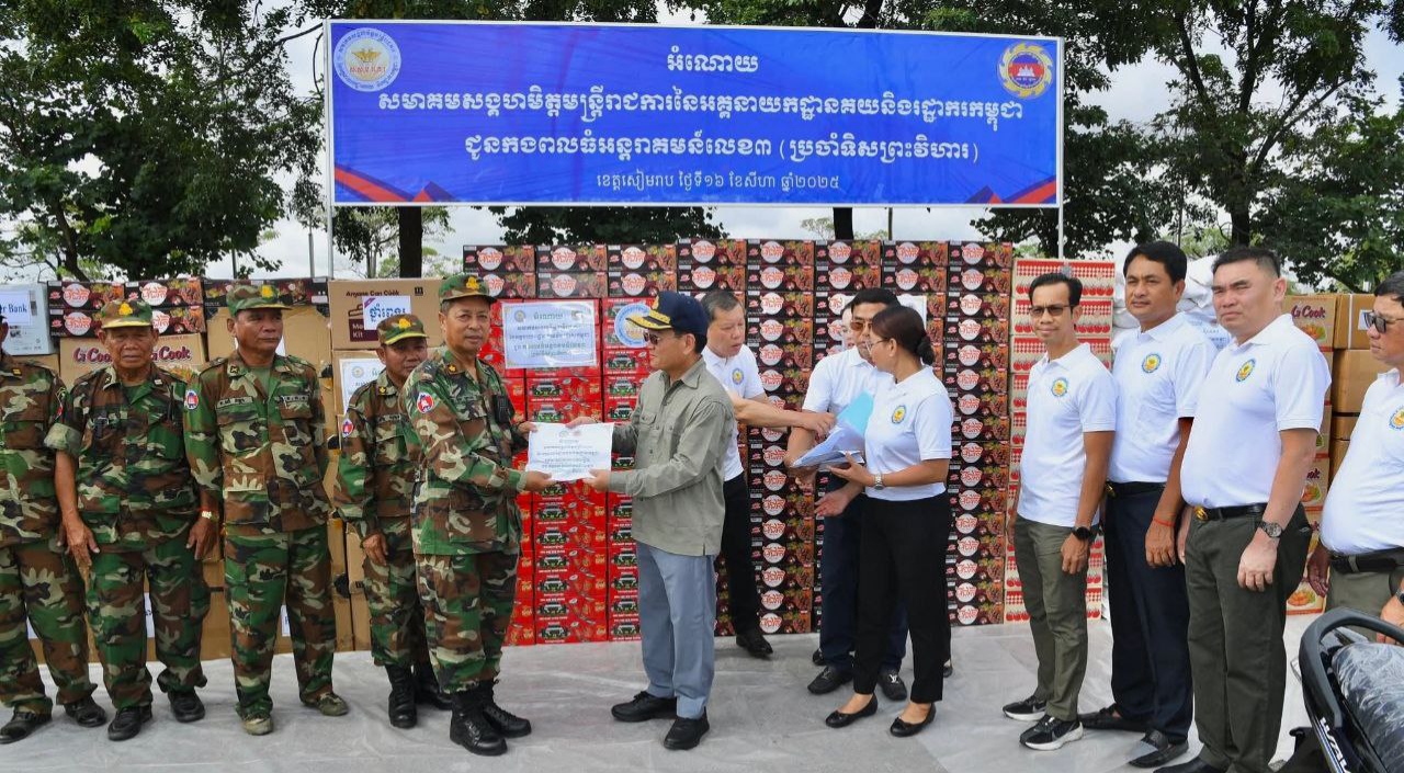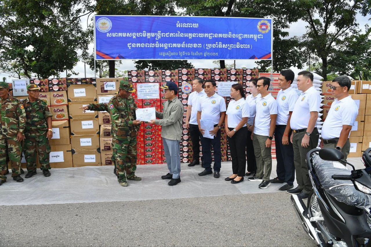 កាលពីព្រឹកថ្ងៃទី១៦ ខែសីហា ឆ្នាំ២០២៥, ឯកឧត្ដមបណ្ឌិត គុណ ញឹម រដ្ឋមន្ត្រីប្រតិភូអមនាយករដ្ឋមន្ត្រី អគ្គនាយកនៃអគ្គនាយកដ្ឋានគយនិងរដ្ឋាករកម្ពុជា និងជាប្រធានសមាគមសង្គហមិត្តមន្ដ្រីរាជការនៃអគ្គនាយកដ្ឋានគយនិងរដ្ឋាករកម្ពុជា និងថ្នាក់ដឹកនាំ ព្រមទាំងមន្ដ្រីគយនិងរដ្ឋាករមួយចំនួនបានប្រគល់អំណោយរបស់ សម្ដេចមហាបវរធិបតី និង លោកជំទាវបណ្ឌិត ជាសម្ភារៈ/បរិក្ខារ គ្រឿងឧបភោគបរិភោគ និងថវិកាមួយចំនួន ប្រគល់ជូនកងពលធំអន្ដរាគមន៍លេខ ៣ (ប្រចាំទិសព្រះវិហារ)។